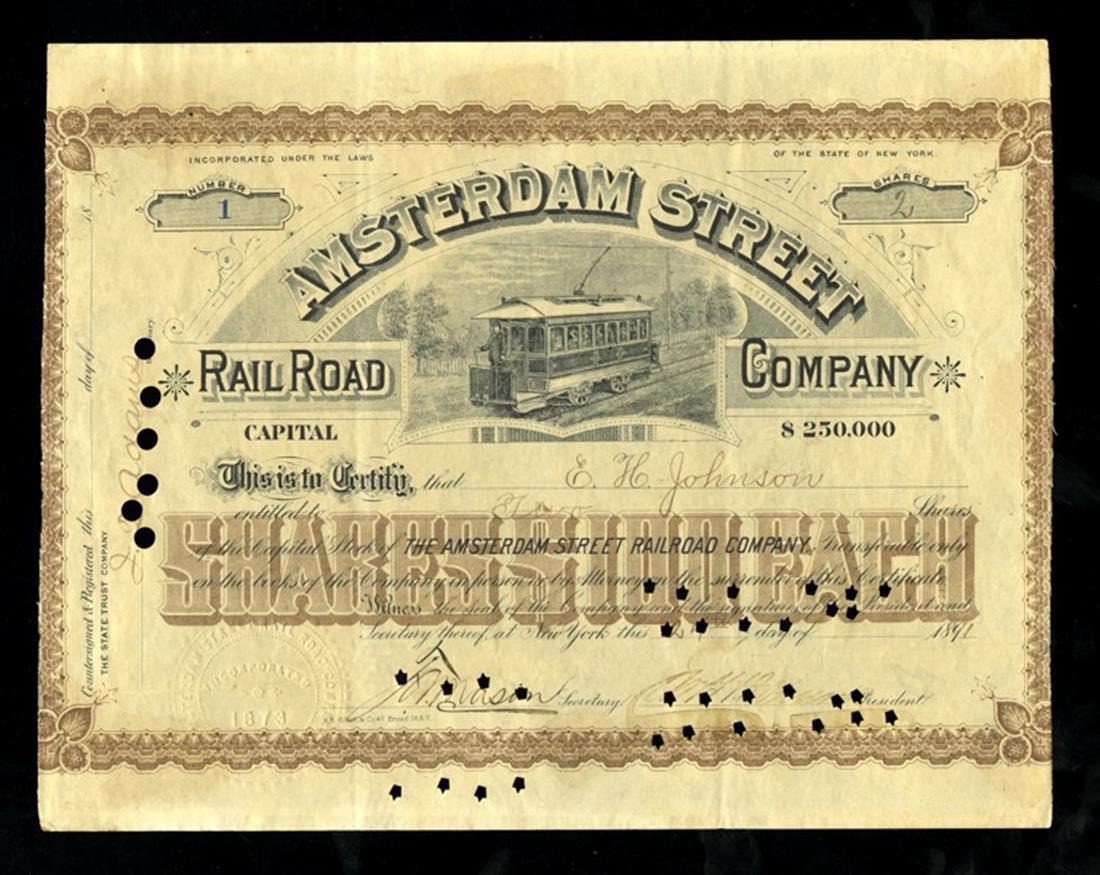 Amsterdam Street Rail Road Company (New York) 1891. 2 shares. Issued, cancelled. No.1. Brown. Serial number 1. Electric streetcar. Issued to E. H. Johnson and signed by him as President. H. R. Elliot & Company, printer. VF. Trimmed into the side borders. Rarity 7 according to Cox, and the only one seen by this cataloger.