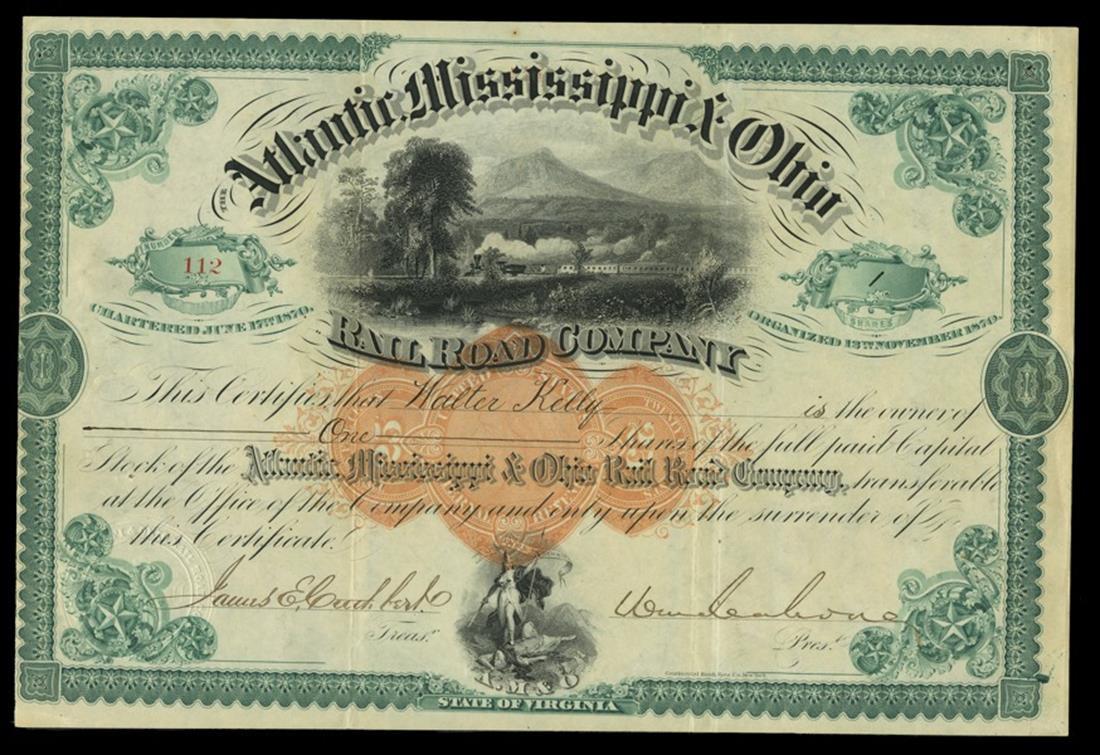 Atlantic, Mississippi & Ohio Rail Road Company (Virginia) 1870. One share. Issued, not cancelled. No.112. Green, with orange imprinted revenue. Train, trees and mountain. Virginia state arms, below. Signed by William Mahone as President, Confederate General who turned looming defeat into victory at Petersburg. Continental Bank Note. VF+. Bold and crisp uncancelled signature of Mahone.