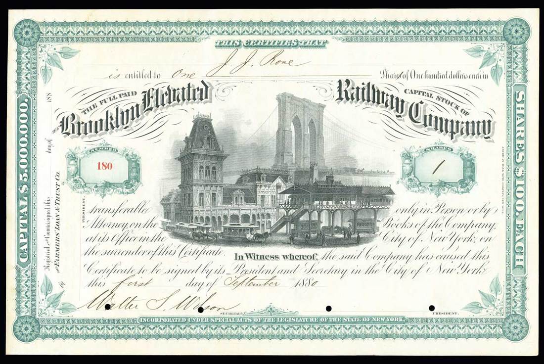 Brooklyn Elevated Railway Company (New York) 1880. One share. Partially prepared, cancelled. No.180. Incredibly detailed view of the elevated railway, ferry terminal, and the Brooklyn Bridge. ABNCO. The line ran from Fulton Ferry to Schenck Ave; Fulton Street to Grand Avenue and Broadway Ferry to Lexington Avenue. EF.
