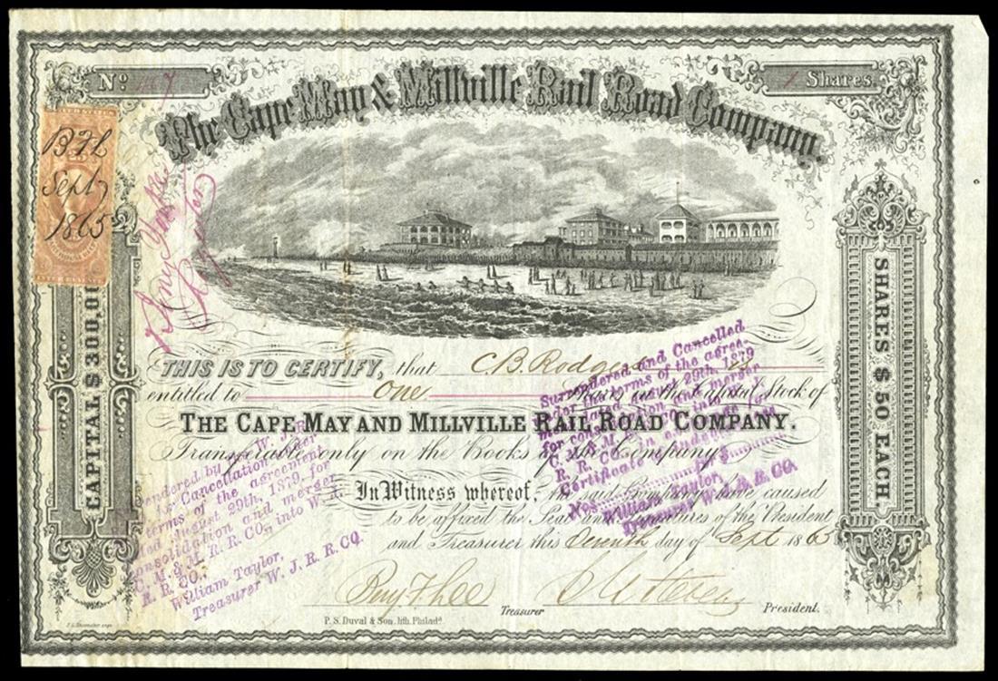 Cape May & Millville Rail Road Company (New Jersey) 1865. One share. Issued, cancelled. No.407. Bathers wearr full-length swim suits in the surf. Hotels beyond. One of the most popular issues from the Penn Central Railroad archive. VF+. Nice grade for this popular issue.