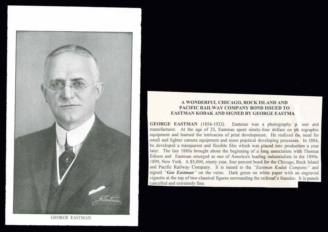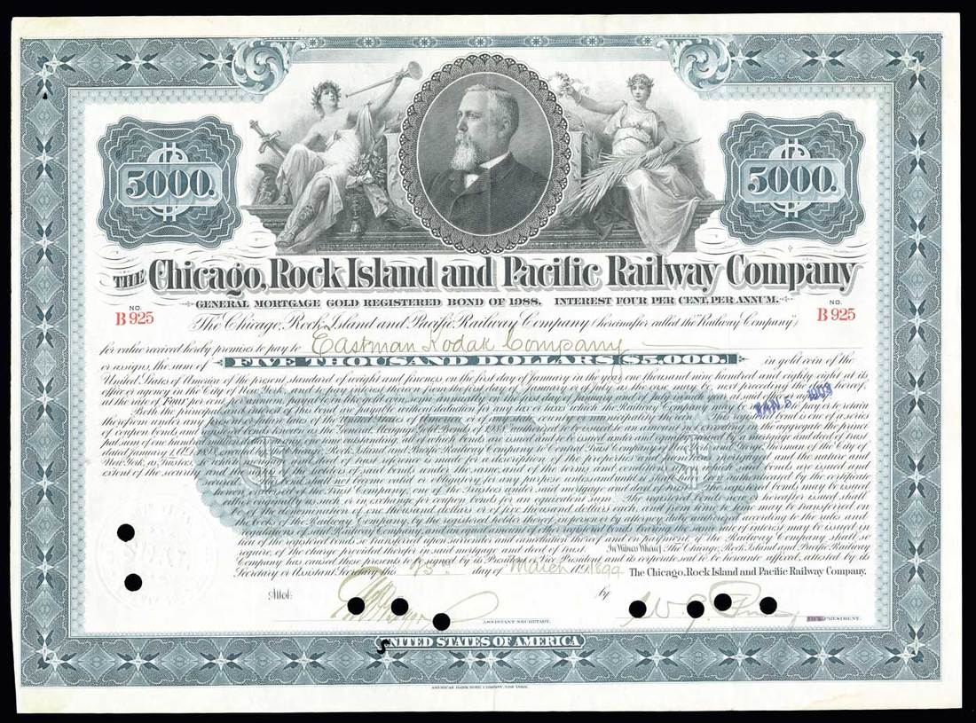 Chicago, Rock Island and Pacific Railway 1899. $5,000 bond. Issued, cancelled. No.B925. Blue. Male portrait flanked by women. Issued to Eastman Kodak Company and signed by George Eastman on the back. VF+. George Eastman perfected the process of making flexible photographic film, and then popularized photography by creating the Kodak, a camera that anyone could own and enjoy.