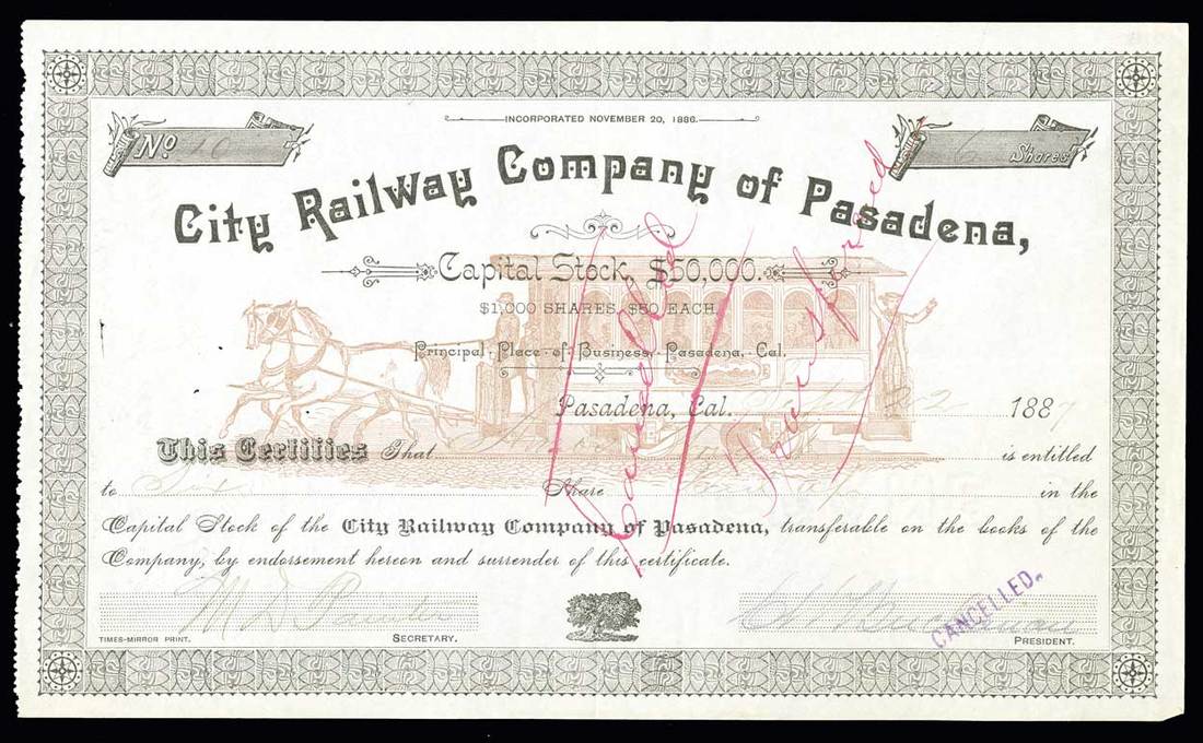 City Railway Company of Pasadena (California) 1887. Pasadena. 6 shares. Issued, cancelled. No.10. Brown underprint of a horse drawn streetcar. Low capitalization of only $50,000. The City Railway Company of Pasadena was a horse car line built in 1887. It ran from Chestnut to Mountain View Avenue. The line was electrified in 1894 by the Pasadena & Los Angeles Railway, abandoned in 1941 from Chestnut to Mariposa, and from Colorado to Chestnut in 1952. Times-Mirror Print. VF. Some pinholes.