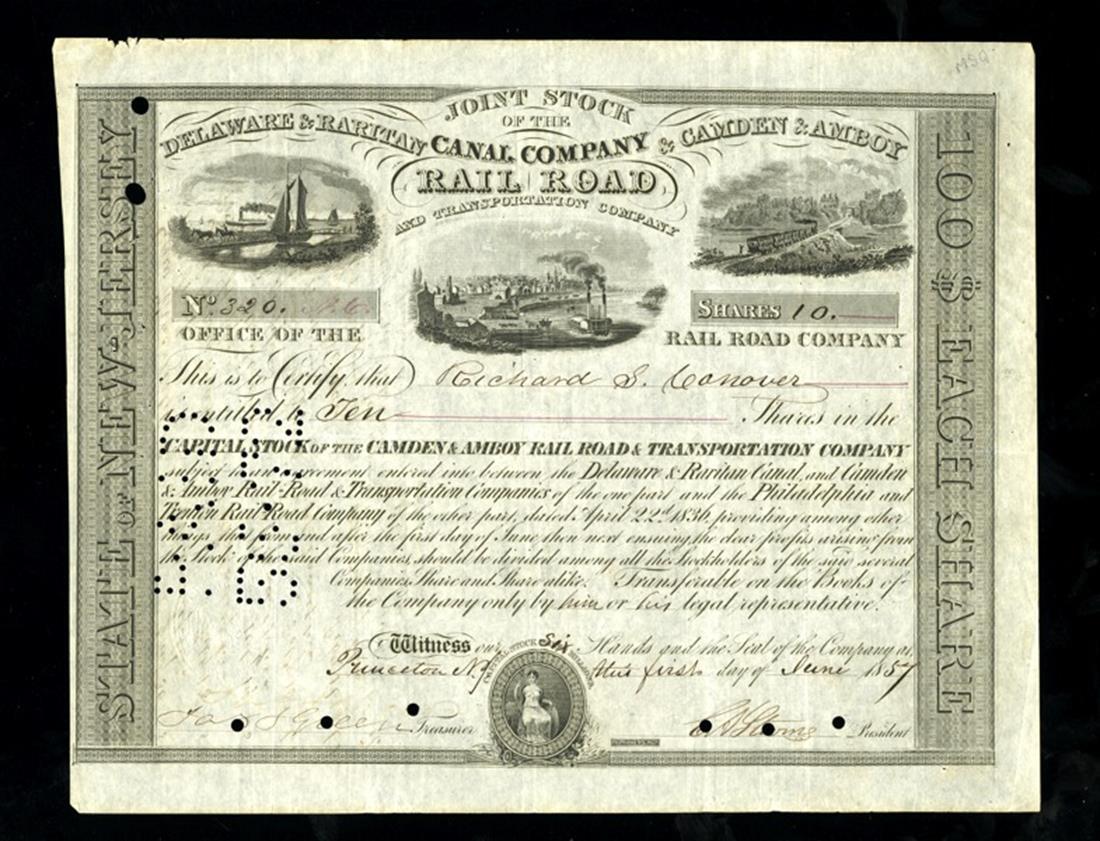 Delaware & Raritan Canal Company & Camden & Amboy Railroad & Transportation Company (New Jersey) 1857. Princeton. 10 shares. Joint stock. Capitalization six million. Issued, cancelled. No.320. Canal scenes, ships, train. Woman below. Charles Toppan and Company, printer. Signed by Edwin A. Stevens as President. Founder of the Stevens Institute of technology. VF+.