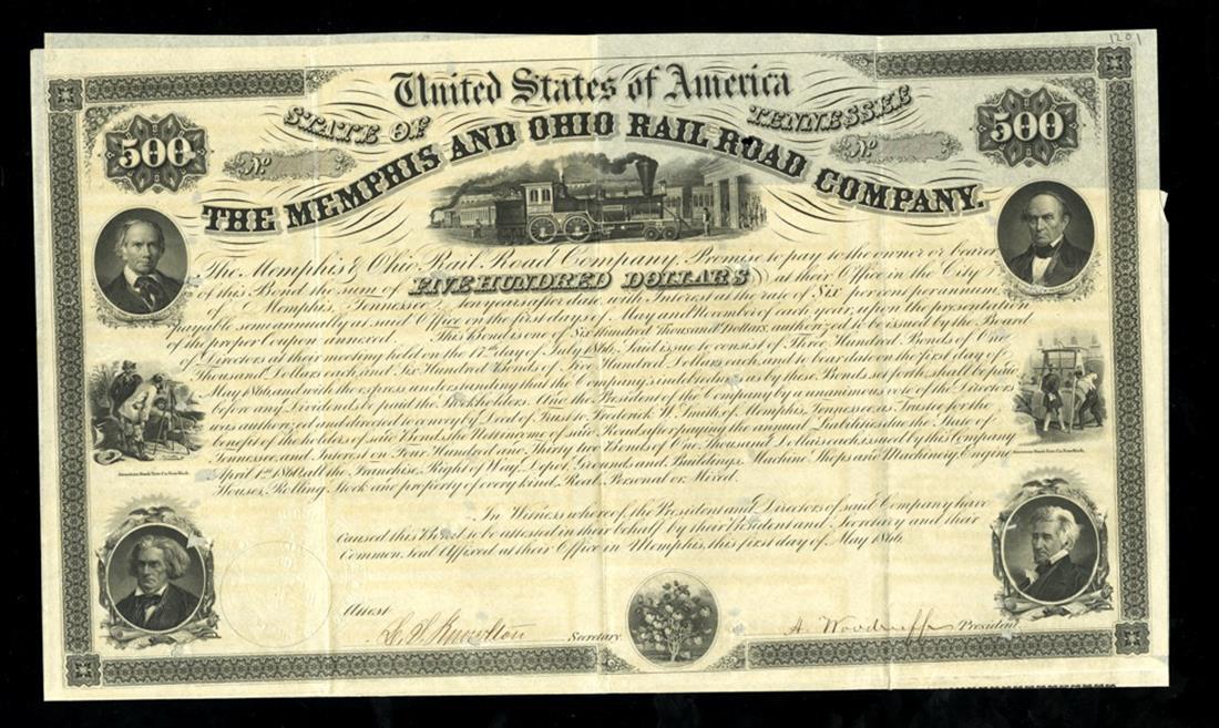 Memphis & Ohio Rail Road Company (Tennessee) 1866. Memphis. $500. Six Per Cent Bond. Issued, not cancelled. No.455. Locomotive "AMERICA." Clay, Webster, Jackson and Johnson. ABNCO. VF+.