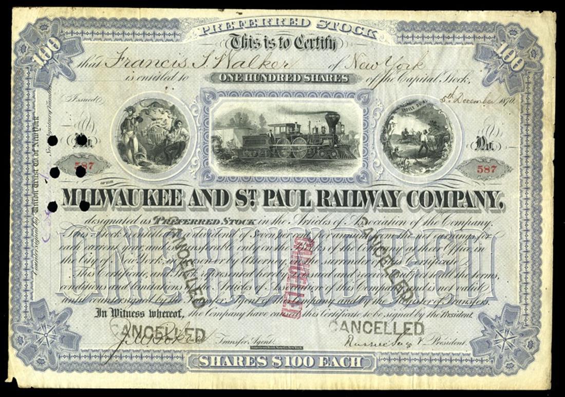 Milwaukee and St. Paul Railway Company 1870. 100 shares. Preferred stock. No.587. Blue. Locomotive faces right, flanked by state arms. Signed by Russel Sage as Vice President. Fine. Some minor damage in the margins. Excellent signature.