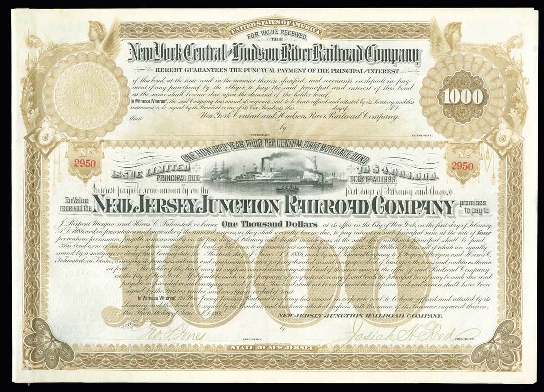 New Jersey Junction Company - New York Central Hudson River Railroad Company (New Jersey) 1886. $1000 bond. Partially prepared, not cancelled. No.2950. Brown. Ships in harbor. Signed by J. P. Morgan as Trustee. ABNCO. EF.