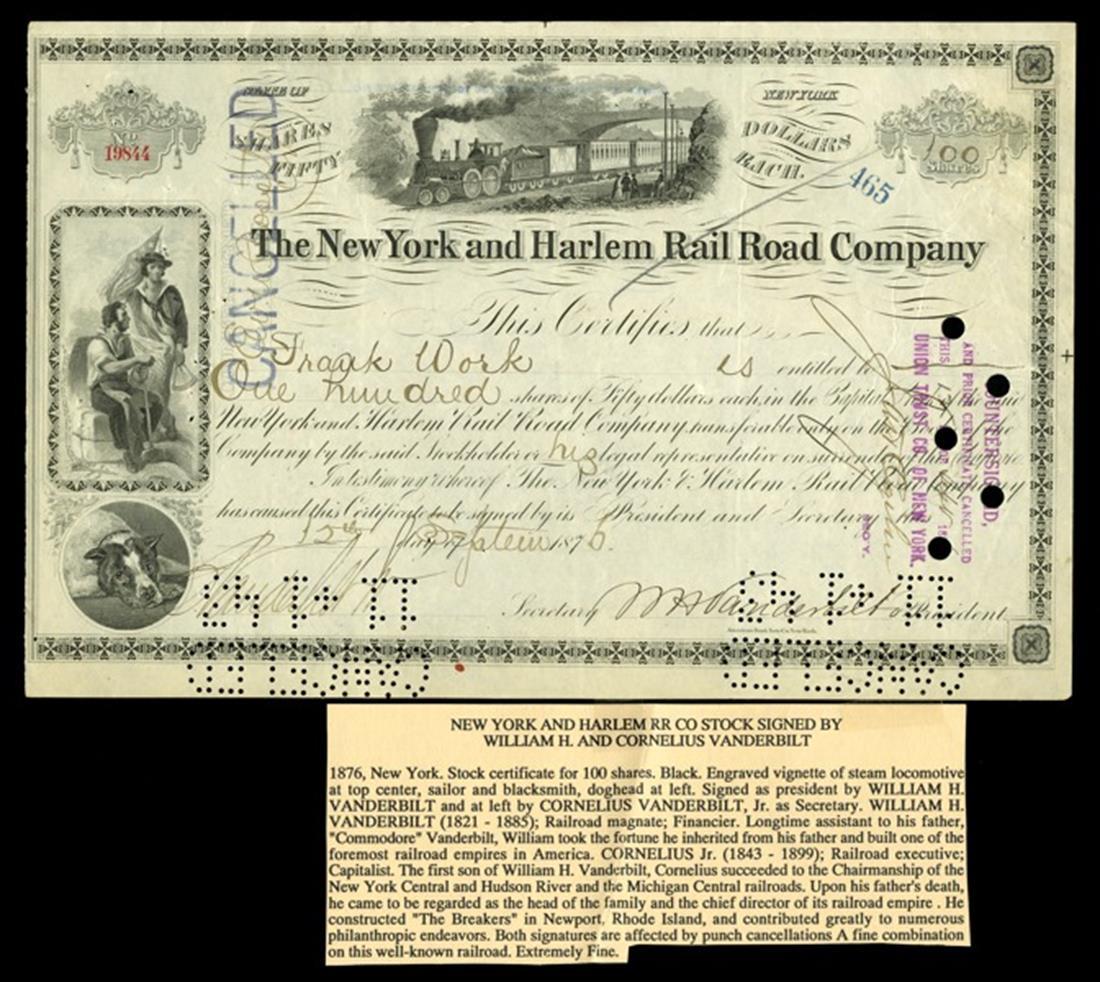 New York and Harlem Rail Road Company (New York) 1875. 100 shares. Issued, cancelled. No.19844. Passenger train facing left. Sailor and blacksmith. Left. Dog. Signed by William H. Vanderbilt as President. ABNCO. VF+. Pin cancels through Vanderbilt's signature.