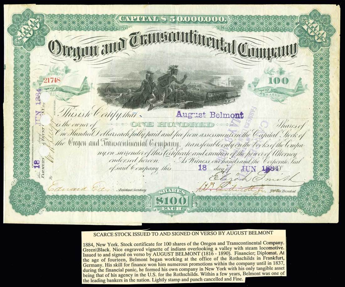 Oregon and Transcontinental Company (Oregon) 1884. 100 shares. Issued, cancelled. No.21748. Green. Indian sees civilization. Issued to and signed by August Belmont, financier and diplomat. He was the U.S. agent for the Rothschilds. VF. Some light age toning, and numerous pinholes, some affecting the signature.