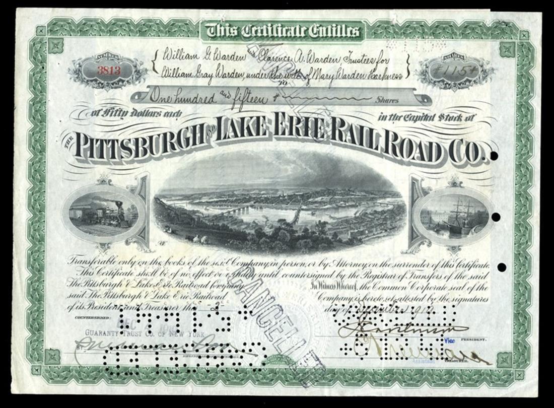 Pittsburgh and Lake Erie Rail Road 1910. 115 shares. Issued, cancelled. No.3813. Green. City, trains and ships. Issued to William G. Warden, James A. Warden, Trustee.