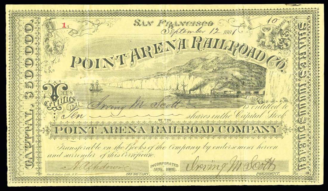 Point Arena Railroad Company (California) 1881. San Francisco office. 10 shares. Issued, not cancelled. No.1. On yellow paper. Panoramic view of Point Arena with a train on the pier that juts out into the cove. Cliffs and mountains. Certificate number one, issued to Irving M. Scott and signed by him as President. Point Arena is the smallest incorporated city in Northern California; it offers the only sheltered cove along the entire Mendocino Coast, and this allowed lumber schooners to load and unload alongside the pier. Unlisted in Cox, and perhaps unique. An extraordinary opportunity if you collect railroads, California, or marvelous graphics on stock certificates VF. Small ink stain in the upper right margin, mentioned only for the sake of accuracy.