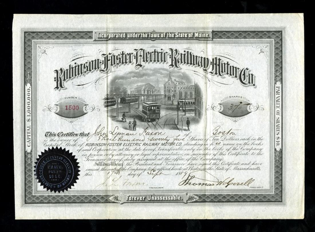 Robinson-Foster Electric Railway Motor (Maine) 1889. Boston. 325 shares. Issued, not cancelled. No.1500. Streetcars in town. VF+.