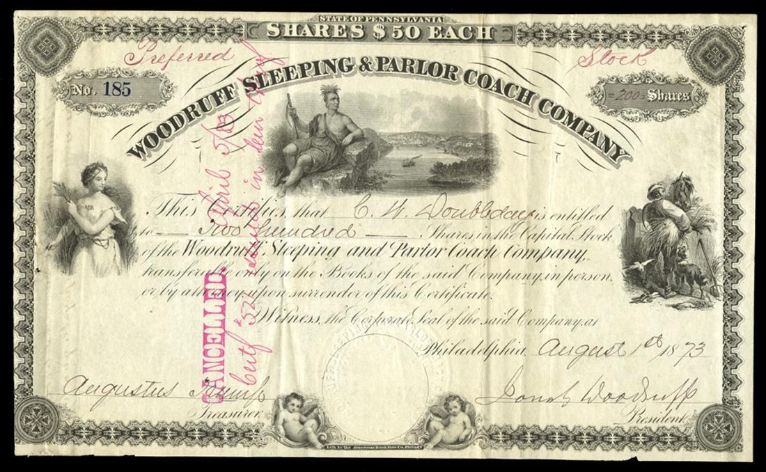 Woodruff Sleeping & Parlor Coach Company (Pennsylvania) 1873. Philadelphia. 200 shares. "Preferred Stock" written in red near the top. Issued, cancelled. No.185. Indian sees civilization for the first time. Woman, left. Farmer, right. Signed by Woodruff as President. ABNCO. VF+. Trimmed into the left border.