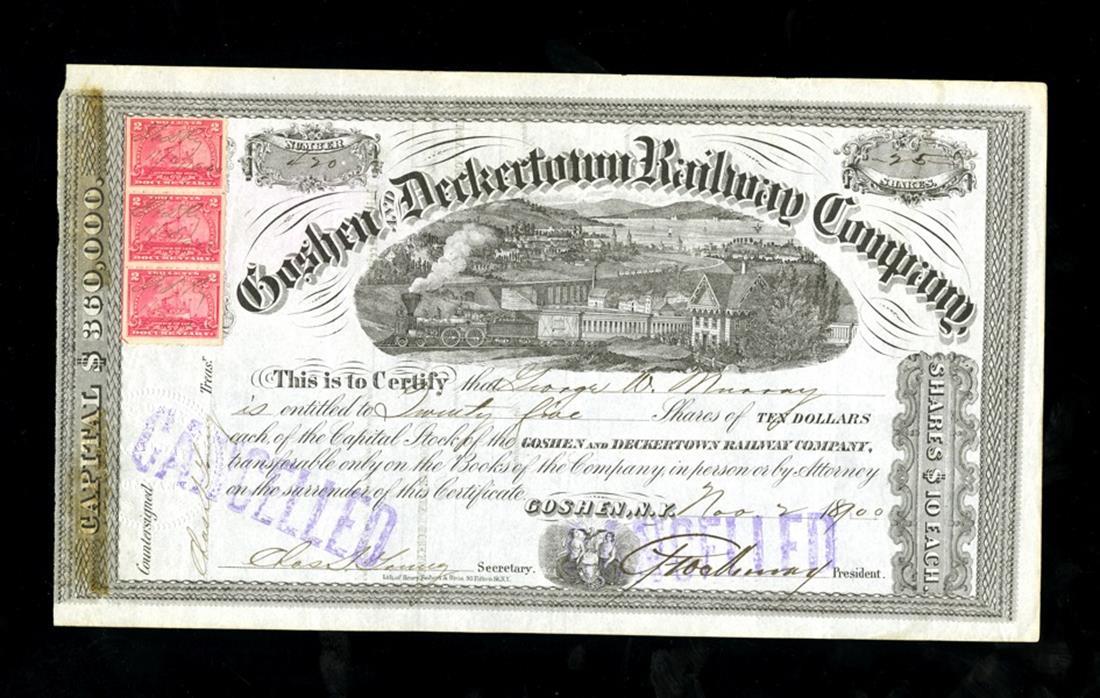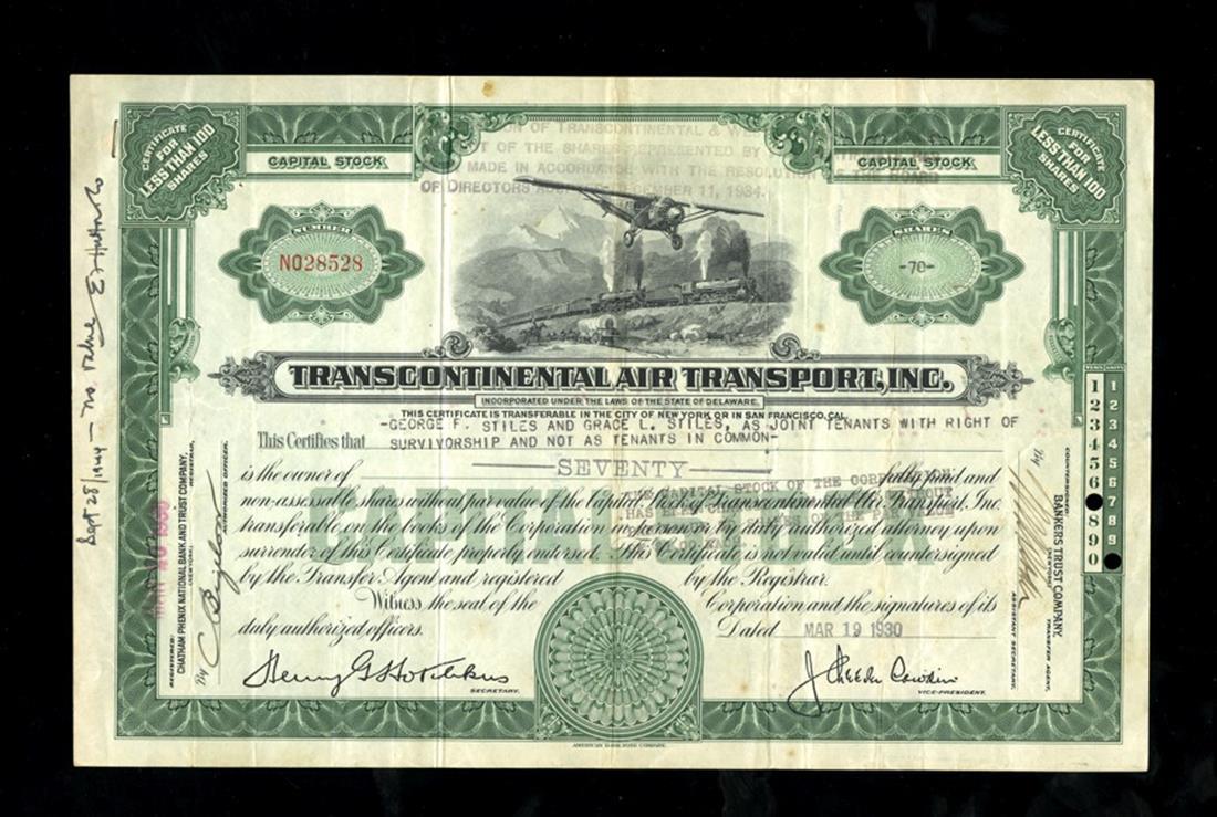 Transportation Share Certificate Grouping Goshen & Deckertown Railway 1900 IC; Transcontinental Air Transport, Inc. 1930 IU; American Dredging 1901 IC; Auto Motive Tractor Corp. 1920 IU; Hudson & Manhattan Rr 1935 IC. Mostly VF or better. [5].