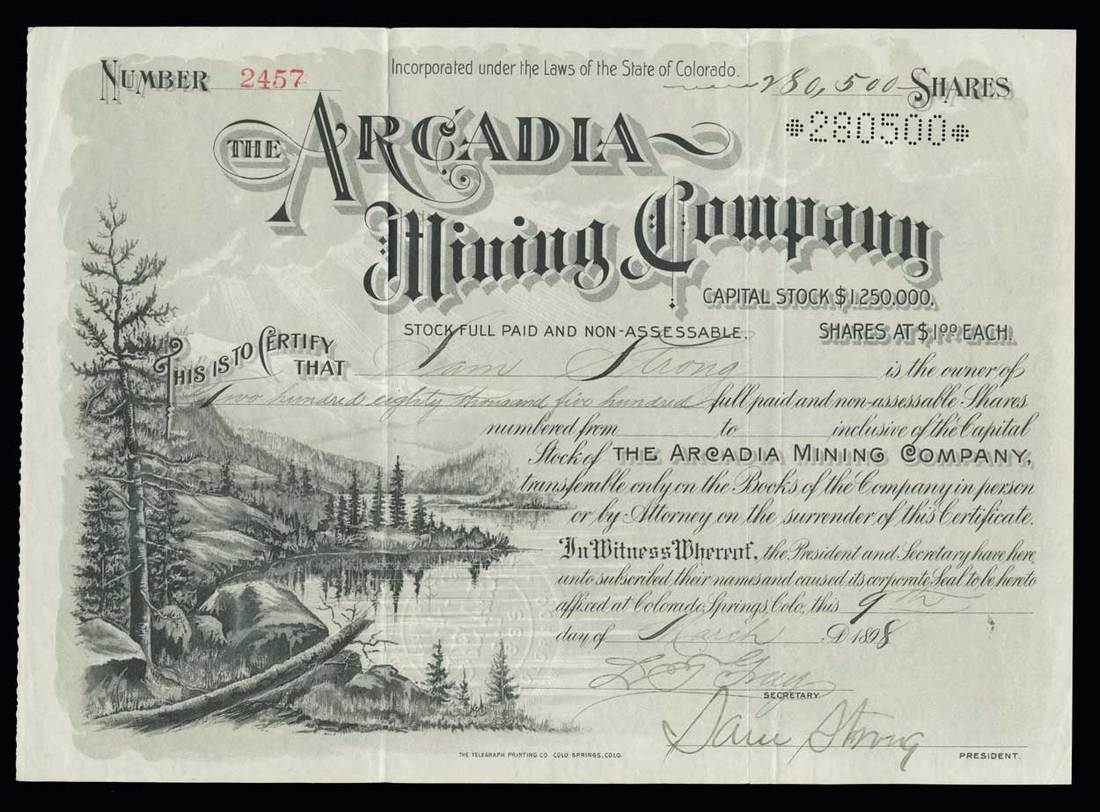 Arcadia Mining Company (Colorado) 1898. Operating in Cripple Creek mining district. 280,500 shares. Issued, not cancelled. No.2457. A huge amount of shares for a single certificate. Full height vignette of pine trees, lake and mountains fills the entire left half of this extraordinary Colorado mining certificate. Issued to Sam Strong and signed by him as President. Telegraph Printing Co. VF+.