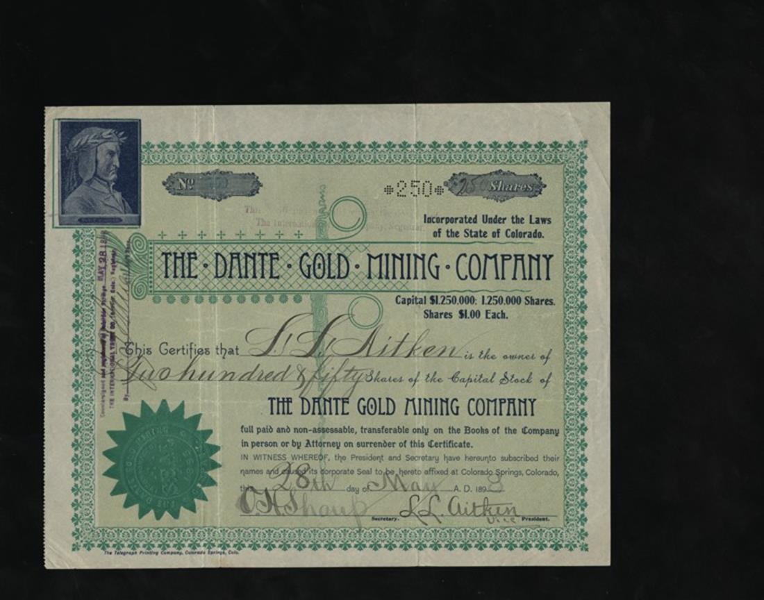 Dante Gold Mining Company (Colorado) 1898. Colorado Springs. 250 shares. Issued, not cancelled. No.159. Green with light olive underprint. Portrait of Dante in rectangular frame, upper left. The Dante Gold Mining Company owned the Dante Lode Mining Claim in the Cripple Creek Mining District in Colorado. The company was formed in 1895 and was dissolved in 1926. Telegraph Printing Co. VF.