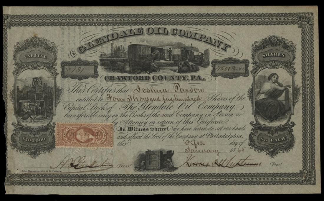 Glendale Oil Company (Pennsylvania) January 5, 1865. Philadelphia. 4,500 shares. Issued, cancelled. No.131. Men load freight car with oil barrels. Tower, right. Woman, left. Life Insurance revenue stamp affixed. Dog and safe below. John Alexander, printer. VF. Trimmed into the left border.
