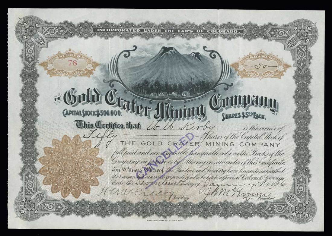 Gold Crater Mining Company (Colorado) 1896. 50 shares. Issued, not cancelled. No.78. Brown. Volcano. Elgan Bank Note. VF+.