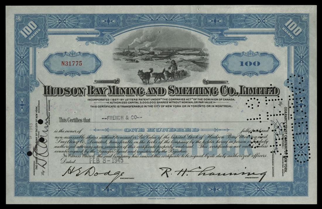 Hudson Bay Mining & Smelting Company (Canada) 1945. 100 shares. Capital stock. Issued, not cancelled. No.N31775. Blue. Huskies pull sled. Mills beyond. EF.