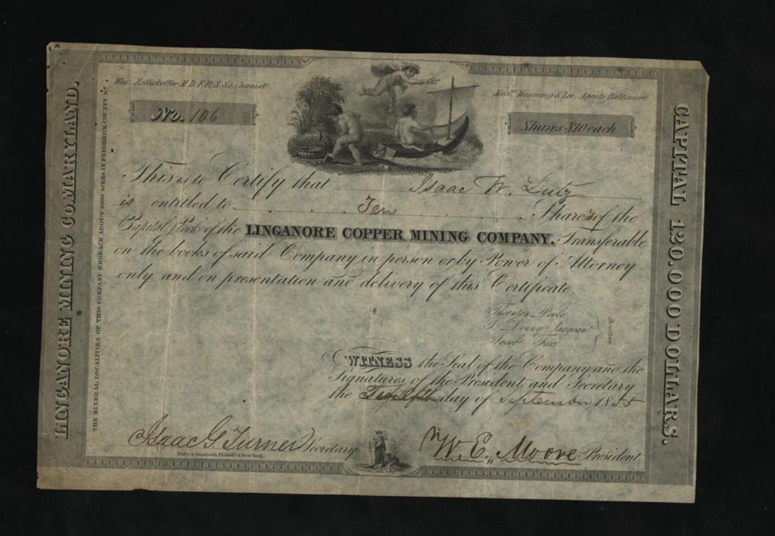 Linganore Coper Mining Company (Maryland) 1855. Frederick. 10 shares. Issued, not cancelled. No.106. Three cherubs, one in a sailboat. Hufty & Danforth. VF. Small corner tip missing. Charming bank note quality engraving.