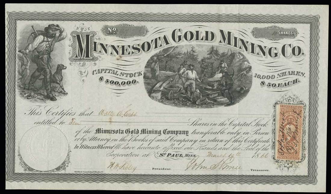 Minnesota Gold Mining Company (Minnesota) 1866. St. Paul. 10 shares. Issued, not cancelled. No.147. Miners work near sluice boxes. Prospector and dog, left. Revenue stamp affixed. Hatch & Co. EF. In 1865, State Geologist Henry Eames confirmed the presence of gold & silver-bearing quartz in the rocks of the Lake Vermilion area in northeastern Minnesota. Fifteen mining companies formed, but little gold was discovered. Prospectors soon abandoned the area and moved westward.
