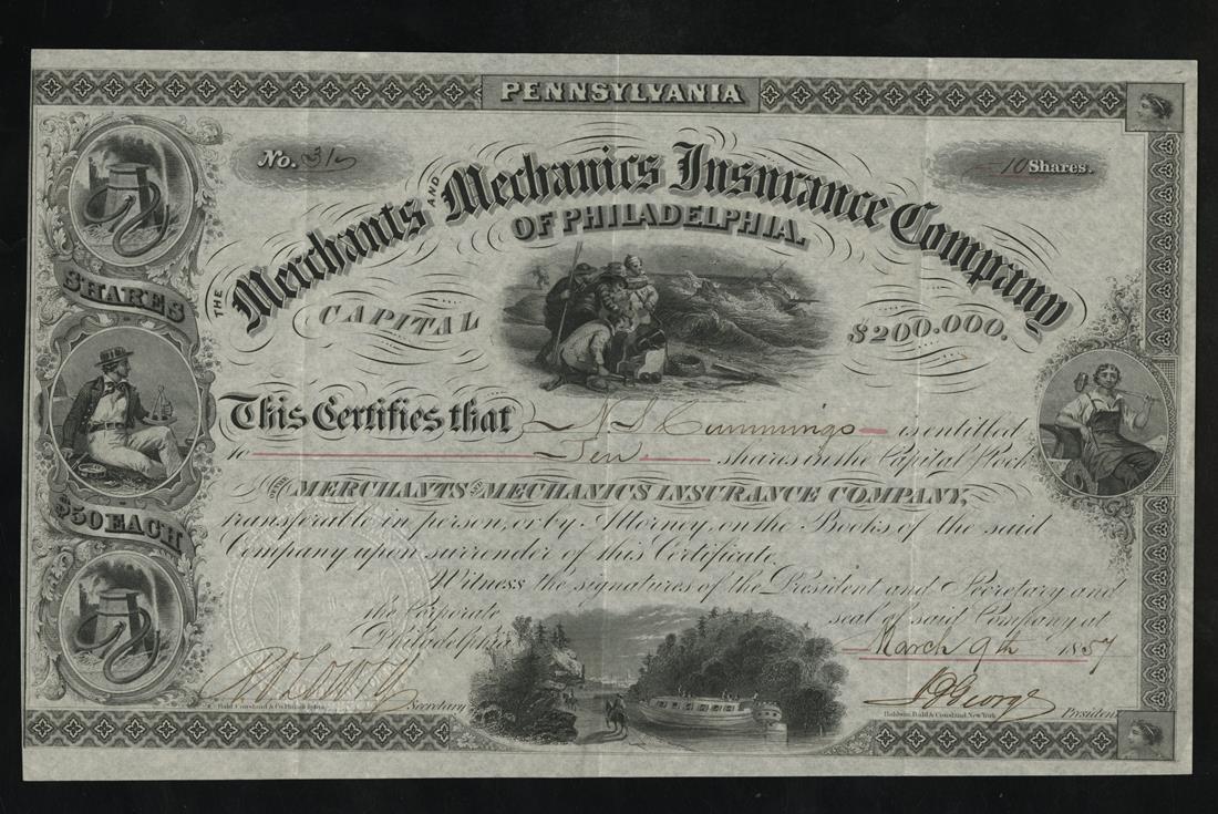 Merchants and Mechanics Insurance Company of Philadelphia 1857. 10 shares Capital Stock. Issued, not cancelled. No.31. Men on the beach fire a cannon loaded with a rescue line to a ship foundering in the surf. Sailor and fire hydrants, left. Mechanic, as on Confederate notes, right. Canal barge below. All beautifully engraved and printed by Baldwin, Bald & Cousland, New York. VF+. An excellent example of one of the nicest bank note quality certificates ever issued. Rarely offered.