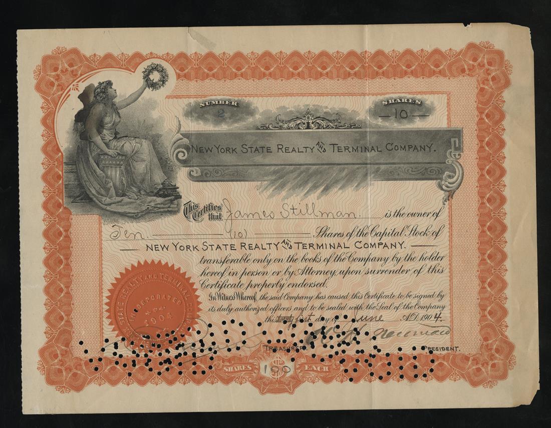 New York State Realty and Terminal Company (New York) 1904. 10 shares. Issued, cancelled. No.2. Orange borders and underprint. Woman raises victory wreath. Issued to and signed by James Stillman on the verso. VF. There is a small repaired tear at the top, and numerous punch cancels through the signature blocks. These do not affect the James Stillman signature on the verso. James Stillman and his National City Bank may have had as much influence and power as J. P. Morgan. He developed close ties with John D. Rockefeller and his associates, and with E. H. Harriman. Stillman believed in maintaining adequate cash reserves, and this served him well during the panic of 1907. National City Bank is now known as Citibank. The Stillman autograph is rarely seen on stocks and bonds.
