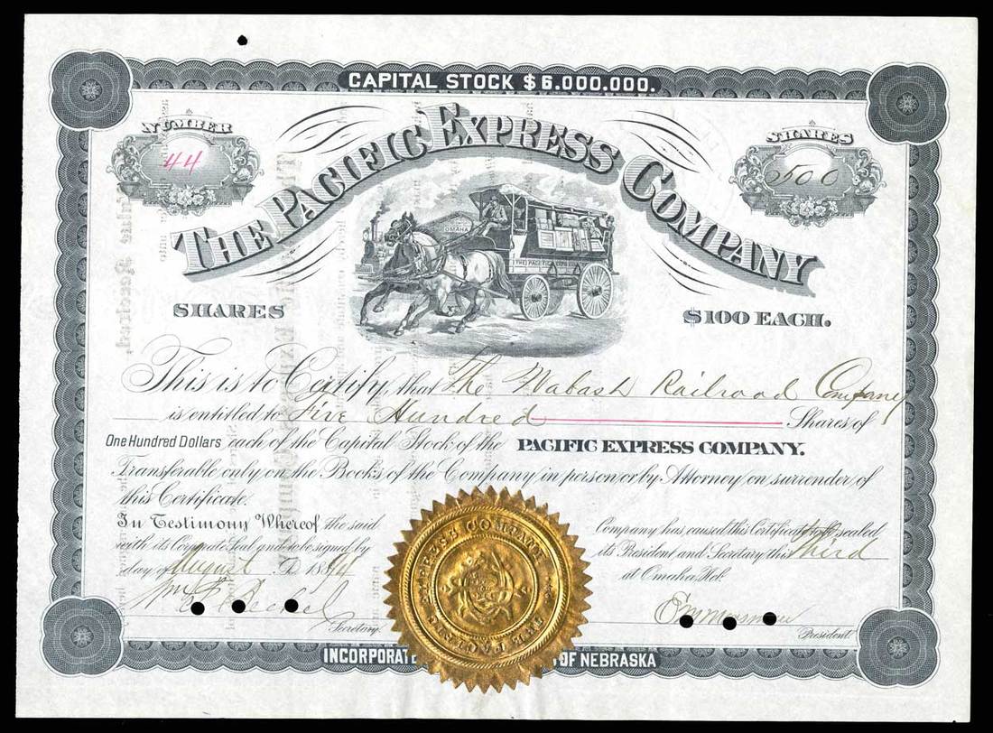 Pacific Express (Nebraska) 1894. Omaha. 500 shares. Issued, cancelled. No.44. Gold seal below. Express Company wagon. The Union Pacific Railway Company owned $2,400,000 worth of Pacific Express stock in 1889. VF+. Small punch cancels.