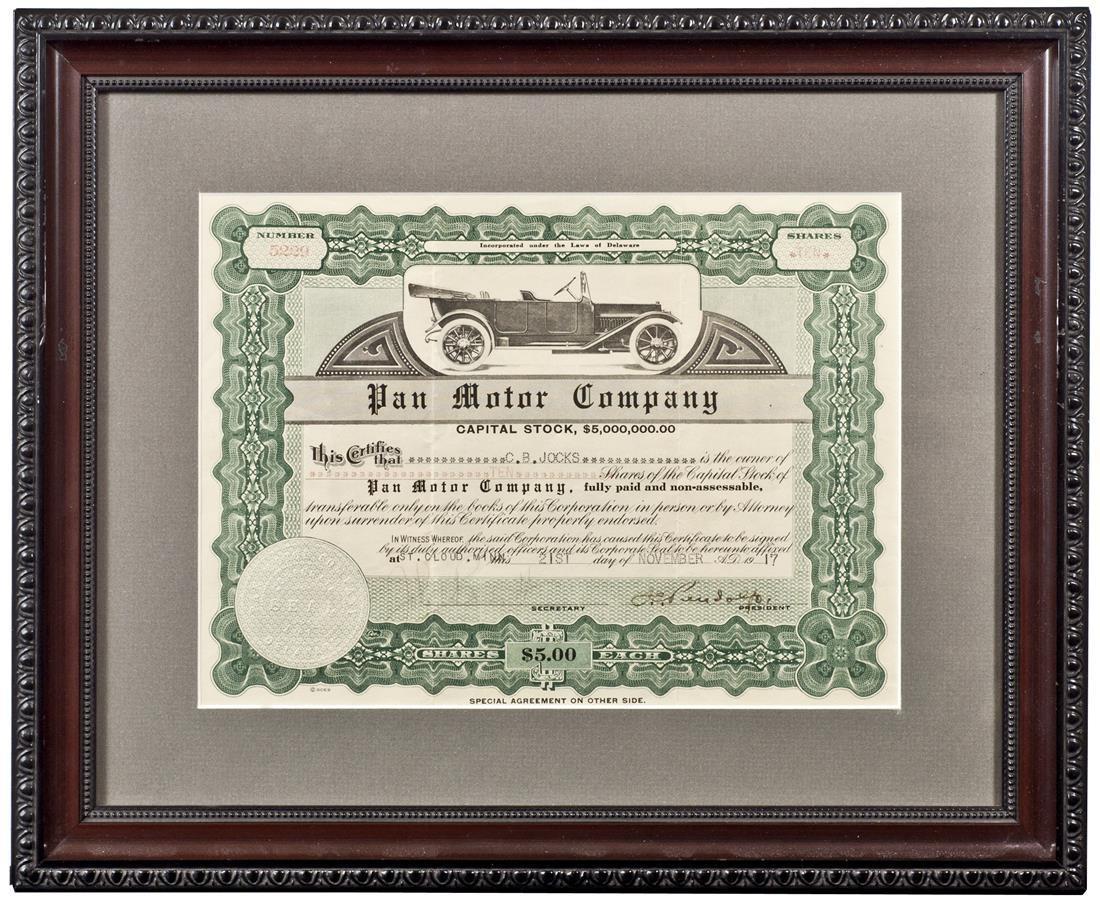 Pan Motor Company (Delaware) 1917. Issued in St. Cloud, Minnesota. 10 shares. Issued, not cancelled. No.5229. Green. Touring car. Signed by Sam Pandolfo as President. Pandolfo perpetrated one of the worst frauds in the history of the American car industry by raising over $9,000,000 from investors, but producing only 737 cars in 4 years. VF+. Attractively matted and framed.
