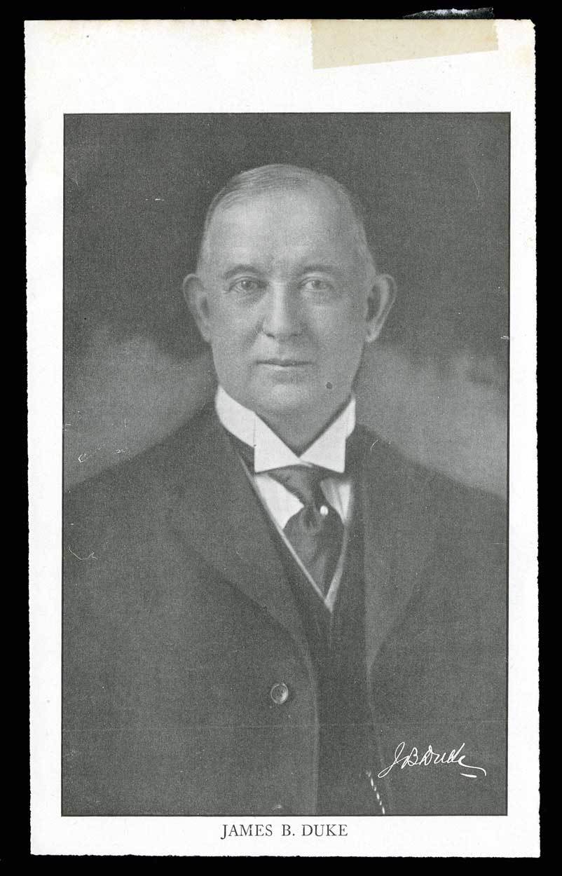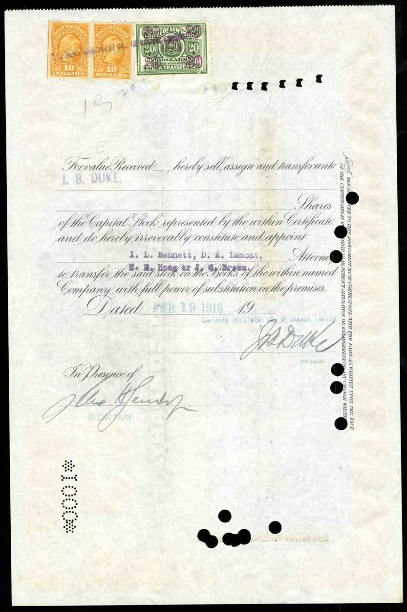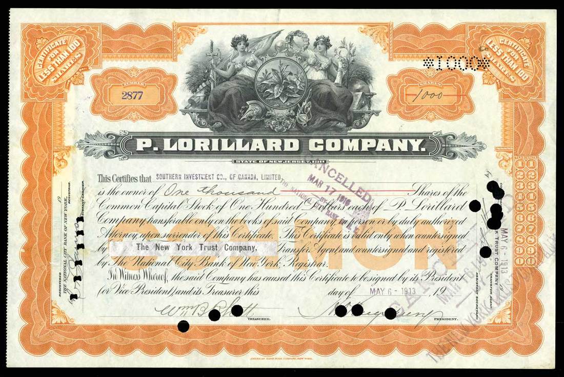 P. Lorillard Company (New Jersey) 1913. 1000 shares. Issued, cancelled. No.2877. Orange borders and underprint. Tobacco plant flanked by women. Transferred to and signed on the back by J. B. Duke. EF. James Buchanan Duke was best known for the introduction of modern cigarette manufacture and marketing. He was a great benefactor of the university which bears his name. He founded the American Tobacco Company, which at one time controlled 150 factories with a capitalization of $502 million in 1911.