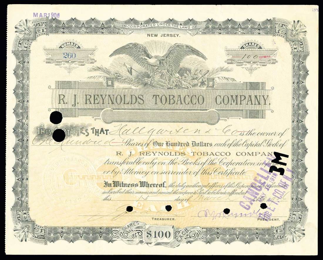 R. J. Reynolds Tobacco Company (New Jersey) 1906. 100 shares. Issued, cancelled. No.260. Eagle. Signed by R. J. Reynolds as President. The son of a tobacco farmer, Reynolds worked on his father's farm, went on to college, and moved to Winston-Salem, North Carolina to start his own tobacco company. He quickly became one of the wealthiest citizens of North Carolina and established a monumental tobacco empire. VF+. Some of the punch cancels are moderately heavy.