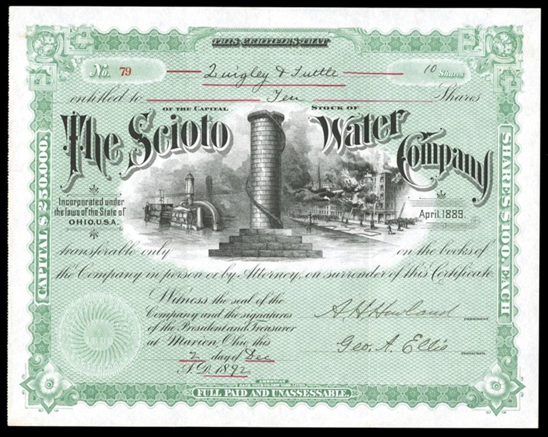Scioto Water Company (Ohio) 1892. Marion. 10 shares. Issued, not cancelled. No.79. Green borders and underprint. Pump, water tower, firefighting scene. ABNCO. EF.
