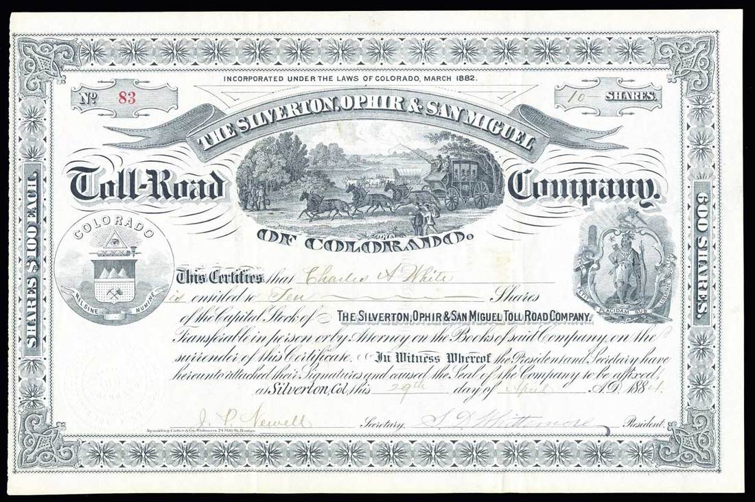 Silverton, Ophir & San Miguel Toll-Road Company of Colorado (Colorado) 1884. Silverton. 10 shares. Issued, not cancelled. No.83. Colorado and Massachusetts state arms flank an oval vignette of a stage coach (rarely encountered on stock certificates) and a covered wagon, "600 Shares" in the end panel at right, VF+. Toll roads had a dramatic impact on the ability to move large quantities of goods in and out of Colorado. Four years after this certificate was issued Otto Mears and others organized the Silverton Railroad Company to move passengers and ores from Silverton to Ouray. VF+. A fine piece of Western Americana.