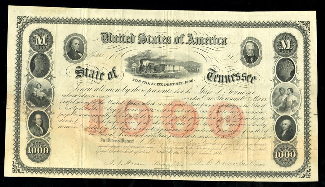 State of Tennessee for the State Debt Due 1866, January 1866. Nashville. $1000. Issued, not cancelled. No.261. Red $1000. Train facing left. Webster, Franklin, Jackson and Adams. Signed by Governor Dunnlow, whose policy of disenfranchising ex-Confederates after the War Between the States made him extremely controversial. ABNCO. VF+. Minor fold splits in the top and bottom margins.