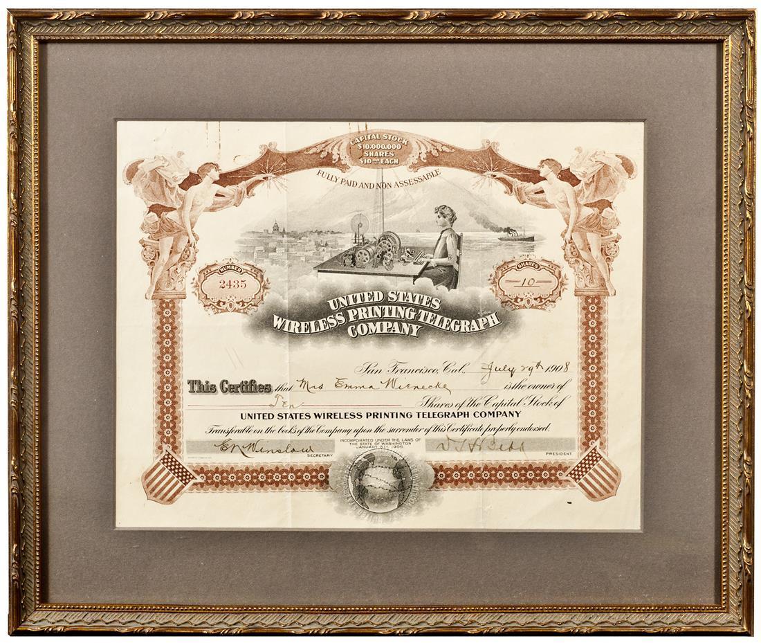 United States Wireless Printing Telegraph Company (Washington) 1908. 10 shares. No.2435. Brown. Woman seated by table with telegraph apparatus. City and ship in the distance. Semi-nude women in the top corners send sparks from their fingers. Globe crisscrossed with sparks, below. VF+. Light paper clip stains. Framed.