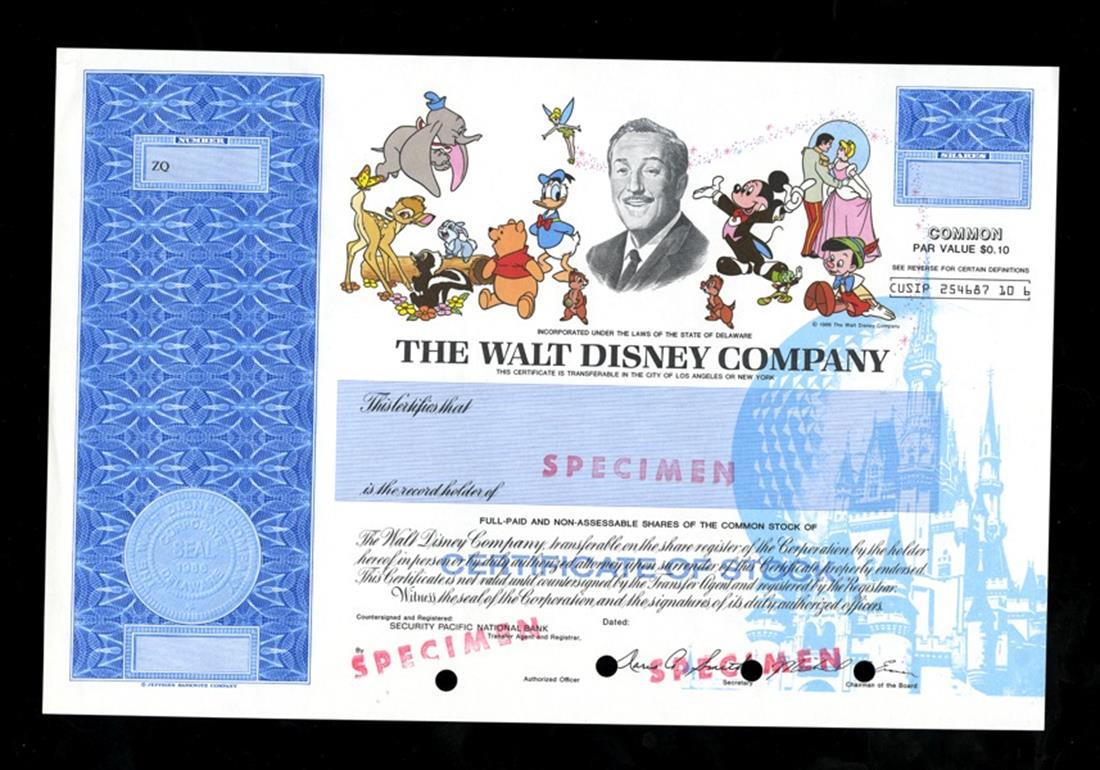 Walt Disney Company (Delaware) 1986. Shares. SPECIMEN. No.ZQ. Blue border and underprint. Multicolor Disney characters. Portrait of Walt Disney. Jeffries Banknote. EF.