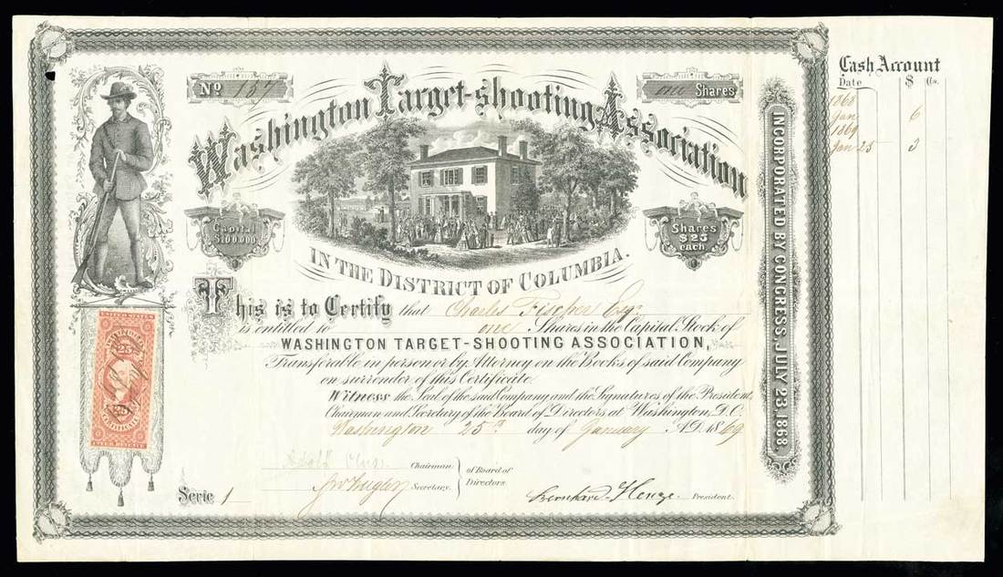 Washington Target-Shooting Association (District of Columbia) 1869. Washington. One share. Issued, not cancelled. No.157. Two story club house. Rifleman. Revenue stamp affixed, left. Also included is a "Certificate of Stock secured by Deed of Trust on Park Property."1880, with red seal. [2]. Both VF+.