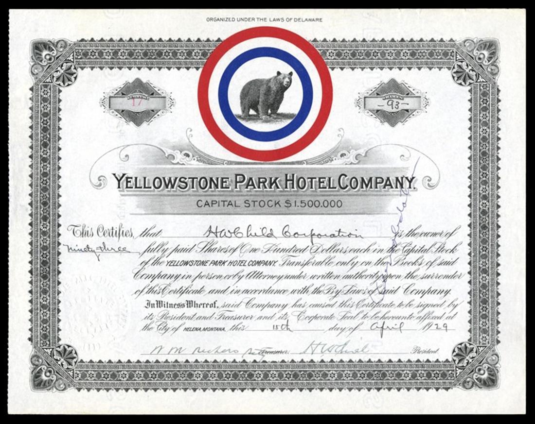 Yellowstone Park Hotel Company (Delaware) 1929. Helena, Montana office. 93 shares. Issued, cancelled. No.17. Red, white an blue. Bear in concentric red and blue circles. This was the company's actual logo, visible on their buildings and busses. Issued to the H. W. Child Corporation and signed by H. W. Child as President. EF.