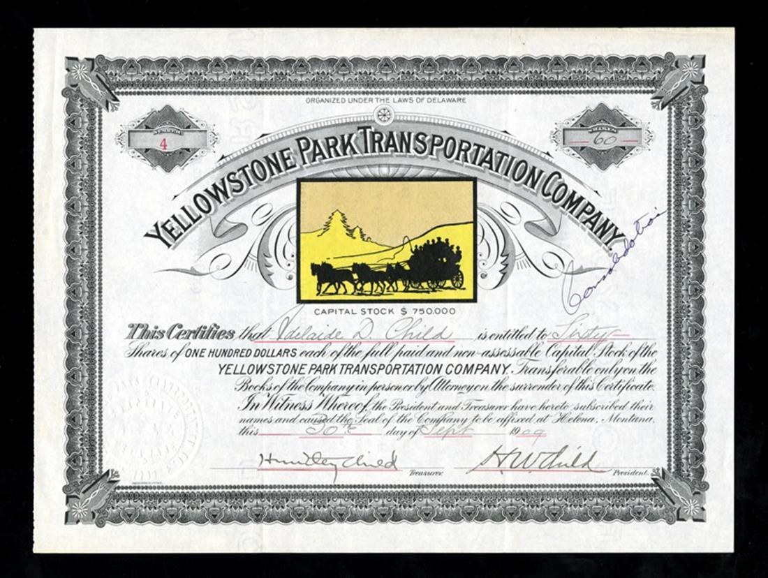 Yellowstone Park Transportation Company (Montana) 1909. Helena, Montana office. 60 shares. Issued, cancelled. No.4. Yellow and tan. Silhouette of a stage coach with mountains and trees beyond. EF.
