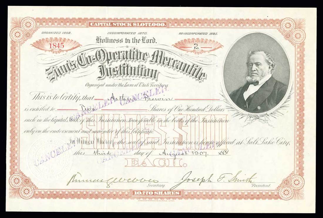 Zion's Co-Operative Mercantile Institution (Utah Territory) 1907. Salt Lake City. 2 shares. Issued, cancelled. No.1845. Red brown border and underprint. Oval shaped portrait of Brigham Young. Signed as President by Joseph F. Smith. ABNCO Litho. VF+. Minor spindle split at the center, barely visible. Joseph F. Smith (1838-1918) was the son of Hyrum Smith and the nephew of Joseph Smith. Smith served seven terms in the Utah territorial House of Representatives. He was President of the Salt Lake Temple, LDS Church President, and the last President to have personally known Joseph Smith, the founder of the Latter Day Saint Movement. The Zion's Co-Operative Mercantile Institution, founded by Brigham Young in 1868, was the first department store in the United States. Included is a photographic print of Smith, suitable for framing.