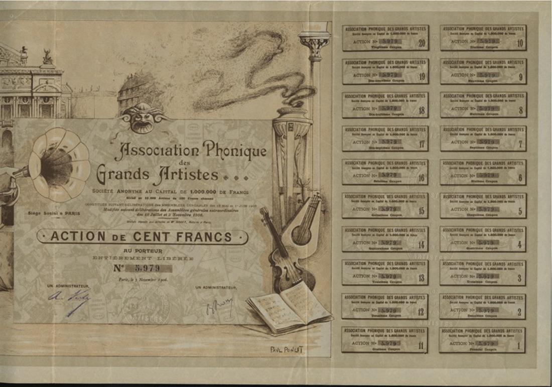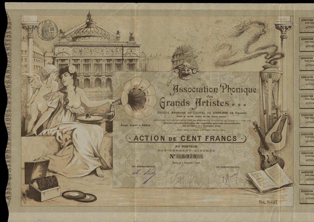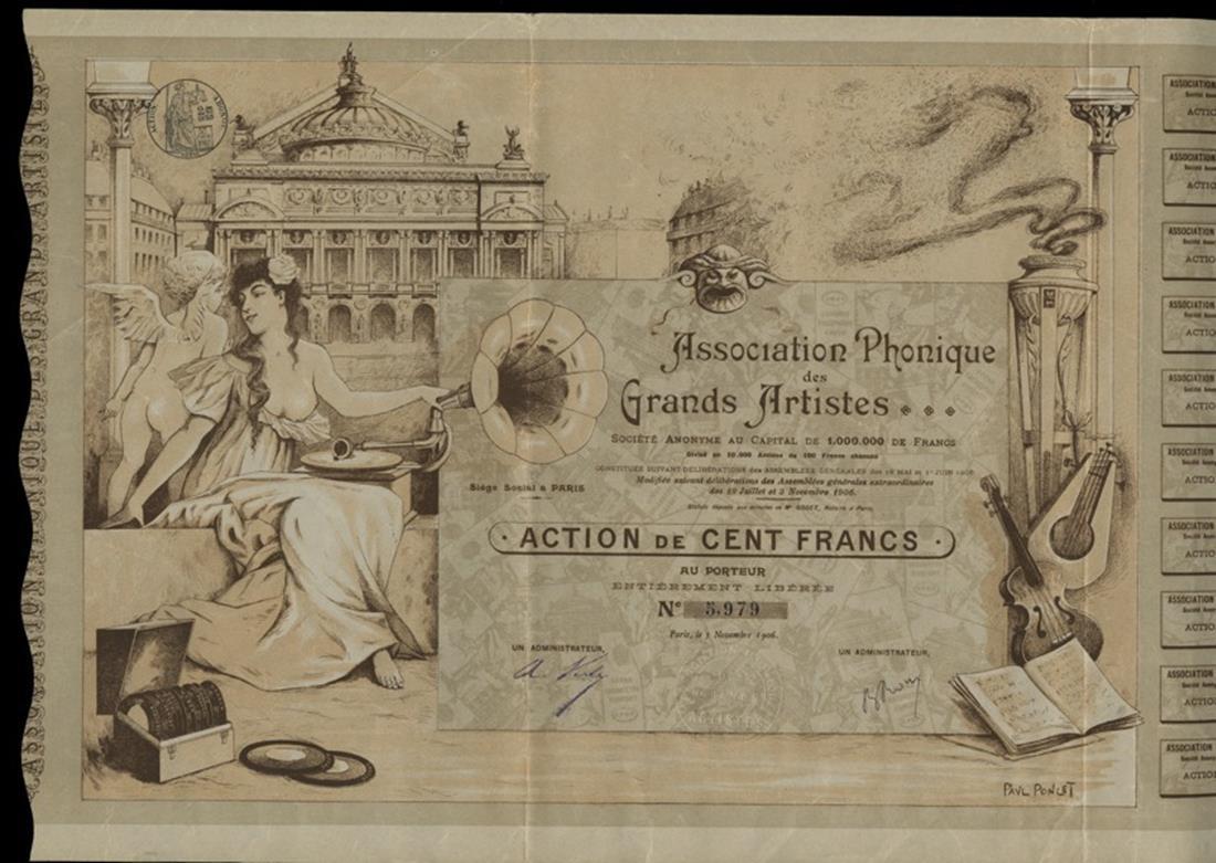Association Phonique des Grand Artistes (France) 1906. Paris. 100 Francs. Issued, not cancelled. No.5979. Brown. Woman seated with phonograph and cherub. Opera house. "Paul Poncet" bottom right. EF.