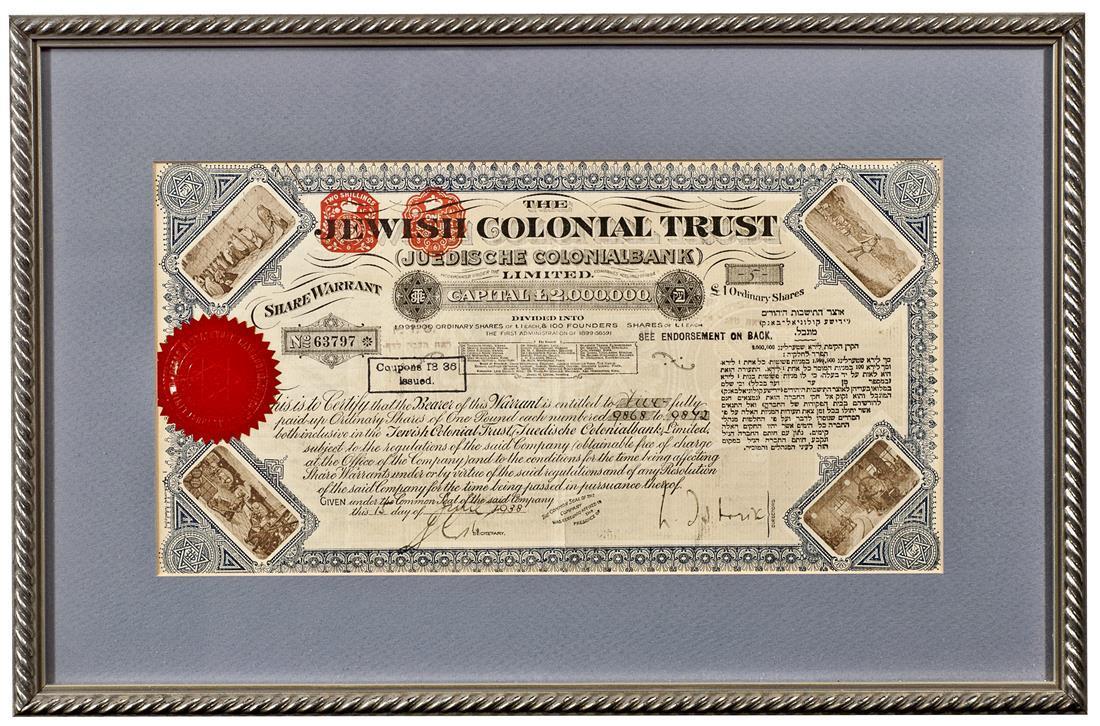 Jewish Colonial Trust (Juedische Colonialbank) (Palestine) 1938. 5 shares. Issued, not cancelled. No.63797. Blue borders, red embossed seal and revenue stamps. Jewish stars, the Wailing Wall and other scenes framed in the corners. VF+. Professionally and attractively framed using archival materials.