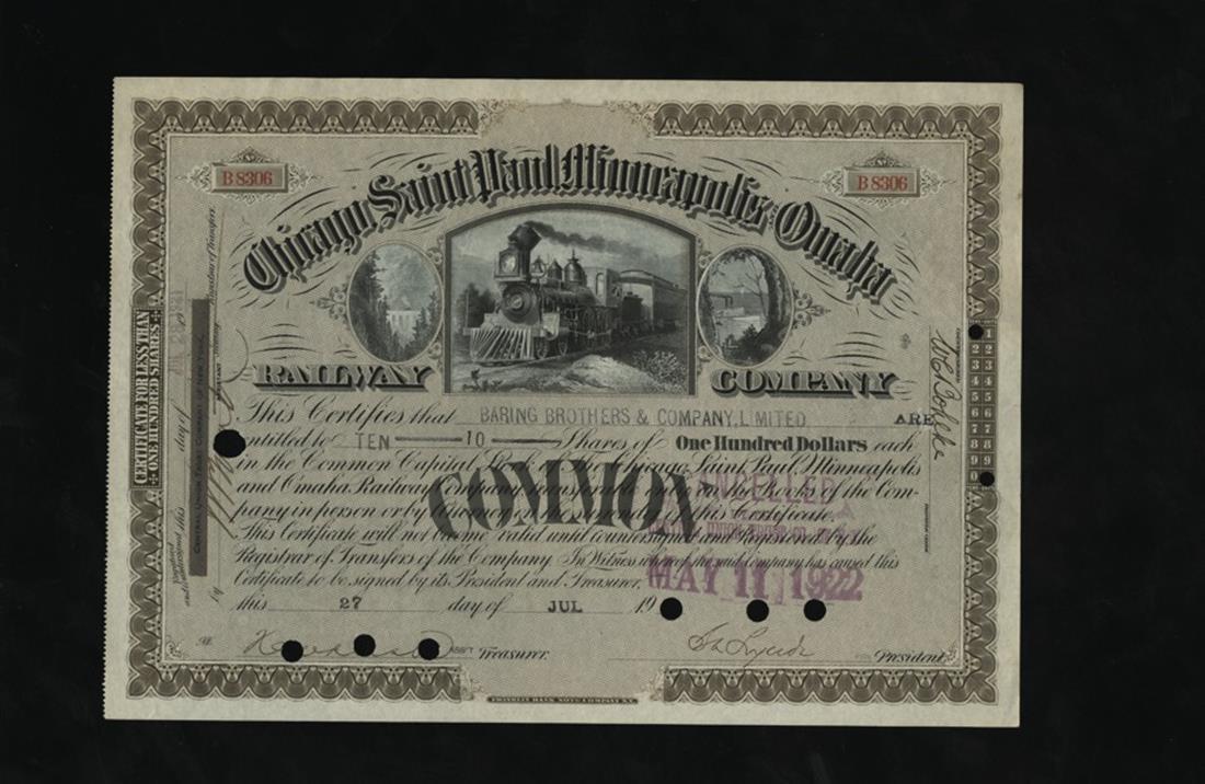 Chicago, Saint Paul, Minneapolis and Omaha Railway Company Grouping. 1880s to 1920s. Shares. Issued, cancelled. Mostly brown. Trains. ABNCO. VF+. [10]