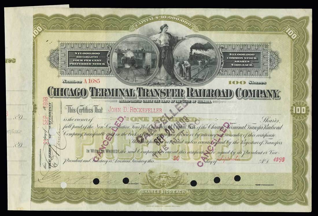 Chicago Terminal Transfer Railroad Company (Illinois) 1898. 100 shares. Issued, cancelled. No.A1685. Olive borders and underprint. Woman flanked by circles with trains and track workers. Issued to and signed by John D. Rockefeller on the back. At the time this was issued Rockefeller was probably the wealthiest man in America. VF +. The stub is lightly pasted over the left border. Ex Smythe January 19, 2001, Lot 1168.