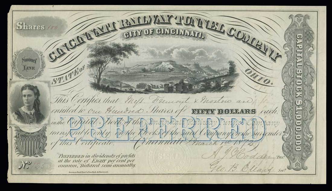 Cincinnati Railway Tunnel Company (Ohio) 1872. Cincinnati. 100 shares. Preferred. Issued, not cancelled. No.125. Blue underprint. Panoramic view of towns, train, trees. Issued to Messers Fremont & Morton and signed on the back by John C. Freemont. John Charles Frémont was an early explorer and mapmaker of the American West, and one of the principal figures responsible for opening that region to settlement. He was instrumental in the U.S. conquest and development of California. Freemont ran unsuccessfully for the U.S. presidency in 1856 as the first candidate of the newly formed Republican Party. VF+. The left margin is a little rough, otherwise quite nice for this issue.