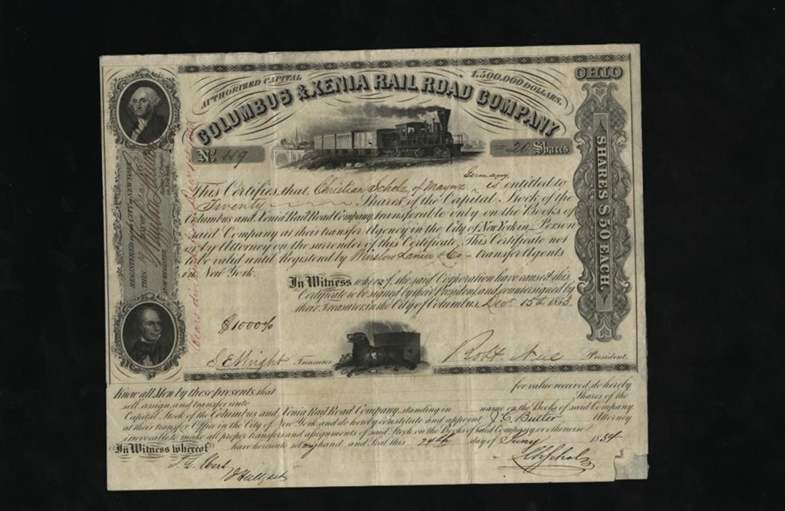 Columbus & Xenia Rail Road Company Trio (Ohio) 1850s. Columbus. Shares. Issued, cancelled. Train facing right. Washington and Clay, left. Dog and safe below. Nice bank note quality vignettes by Toppan, Carpenter. VF. The lower right corners are missing on two of the examples. [3]