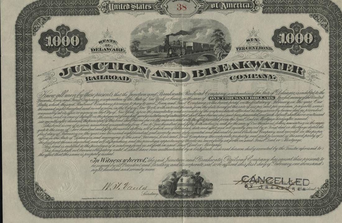 Junction & Breakwater Railroad Company (Delaware) 1879. $1000. Issued, cancelled. No.37. Train facing left. State arms below. National Bank Note Company, printers. VF+. Two small punch holes in the top margin, but otherwise one of the nicest examples of this scarce Penn Central pieces we have seen.