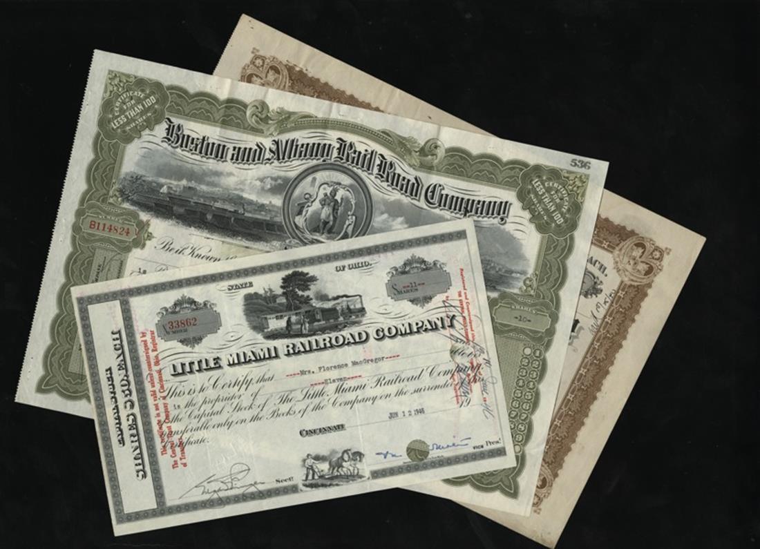 1940s and 1950s Railroad Share Certificate Grouping. Little Miami (3); Boston & Albany (2); East Pennsylvania Railroad (10); Gulf, Mobile & Ohio Railroad (20); Boston & Providence Railroad (10); Western Maryland Railroad (7); New York Central Railroad (20); Belt Rail Road & Stock Yard (11), including some earlier pieces with stains. Mostly VF+. [83]