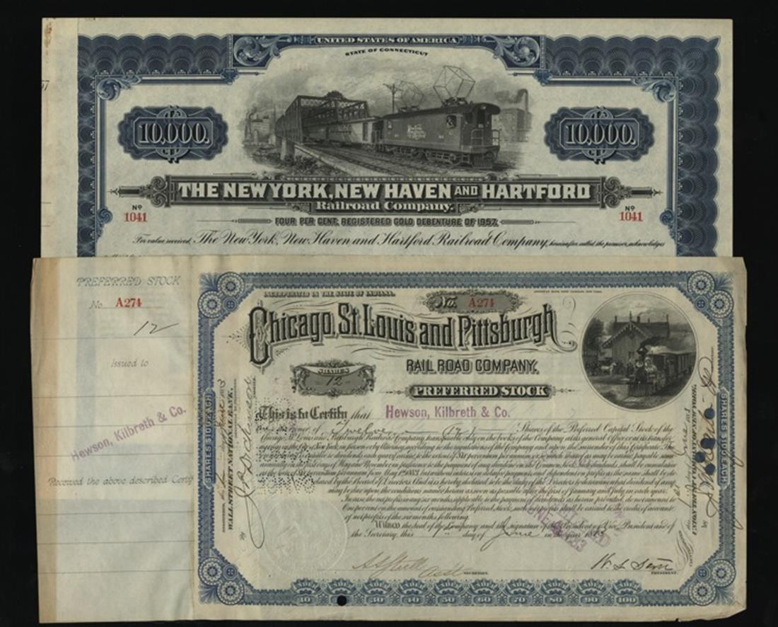 A Large Group of Bonds and Shares, Mostly from the Penn Central Archives. Titles include Cleveland, Columbus, Cincinnati & Indianapolis Rwy 1884; Chicago, St., Louis & Pittsburgh; Beech Creek; Kanawha & Michigan; Lake Shore & Michigan Southern; Michigan Central; New York & Hudson River; West Shore; Boston & Albany; Carthage & Adirondack and more. Most are issued and cancelled, in VF+ to EF condition. Some have numerous punch cancels, typical for those issues. [47]