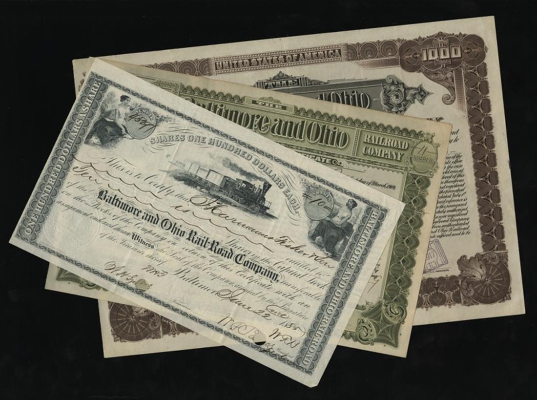 Baltimore & Ohio Bond & Share Assortment 1885-1913. A nice selection of colorful stocks and bonds from this prolific railroad. About a dozen different varieties. Most are VF+, issued, uncancelled. [17] One bond is registered to Louis D. Brandeis.