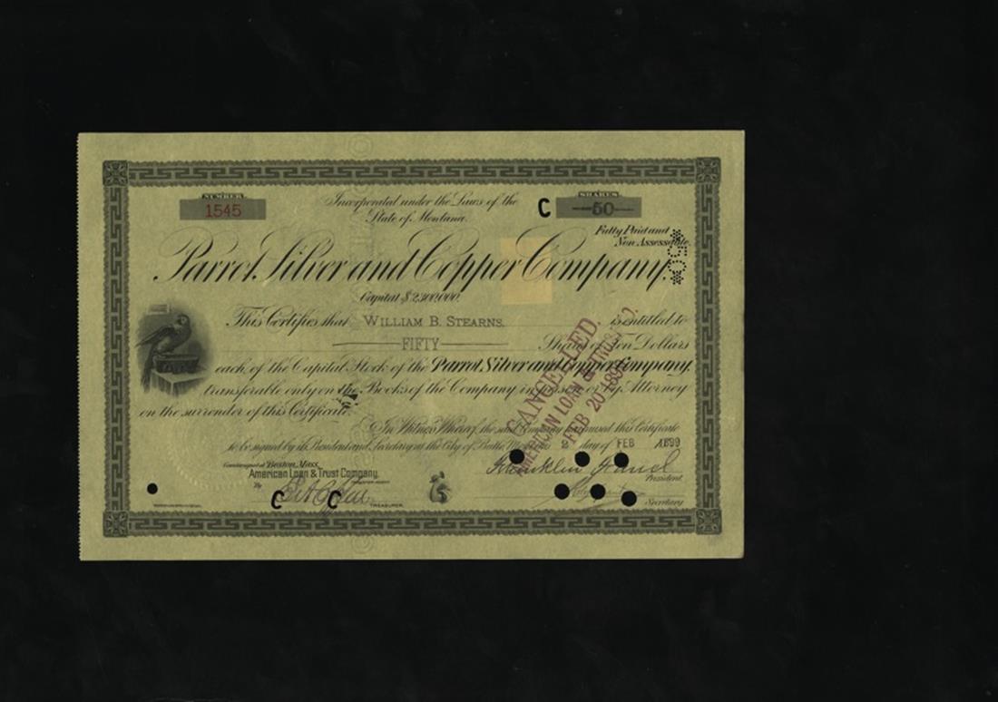Parrot Silver and Copper Company Grouping. 1899-1905. Issued, cancelled. Parrot stands on large ingot. Printed on bright yellow paper. Western Bank Note Company. Mostly EF. [17]